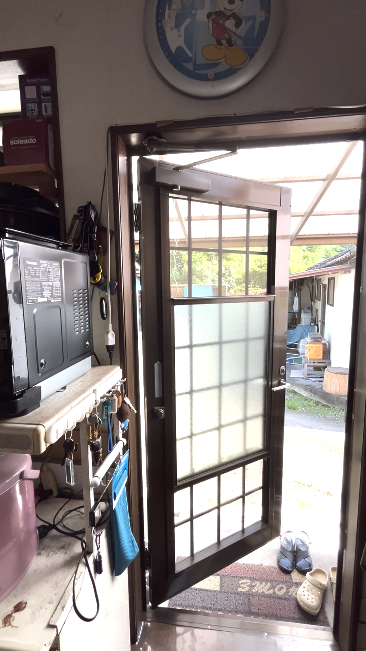私の実家の勝手口のドアが壊れてしまい、開きっぱなしにならず自然と閉まってしまうように・・・!