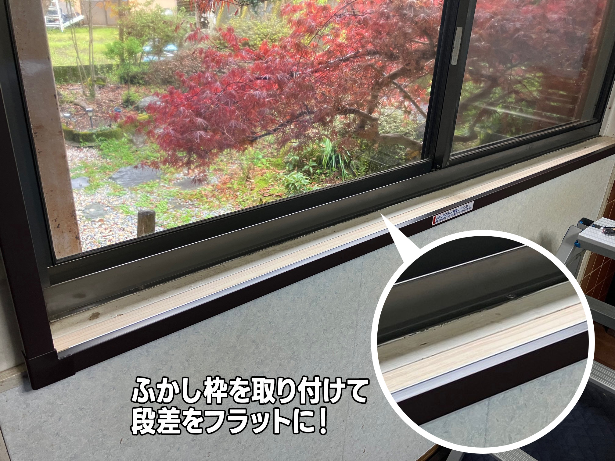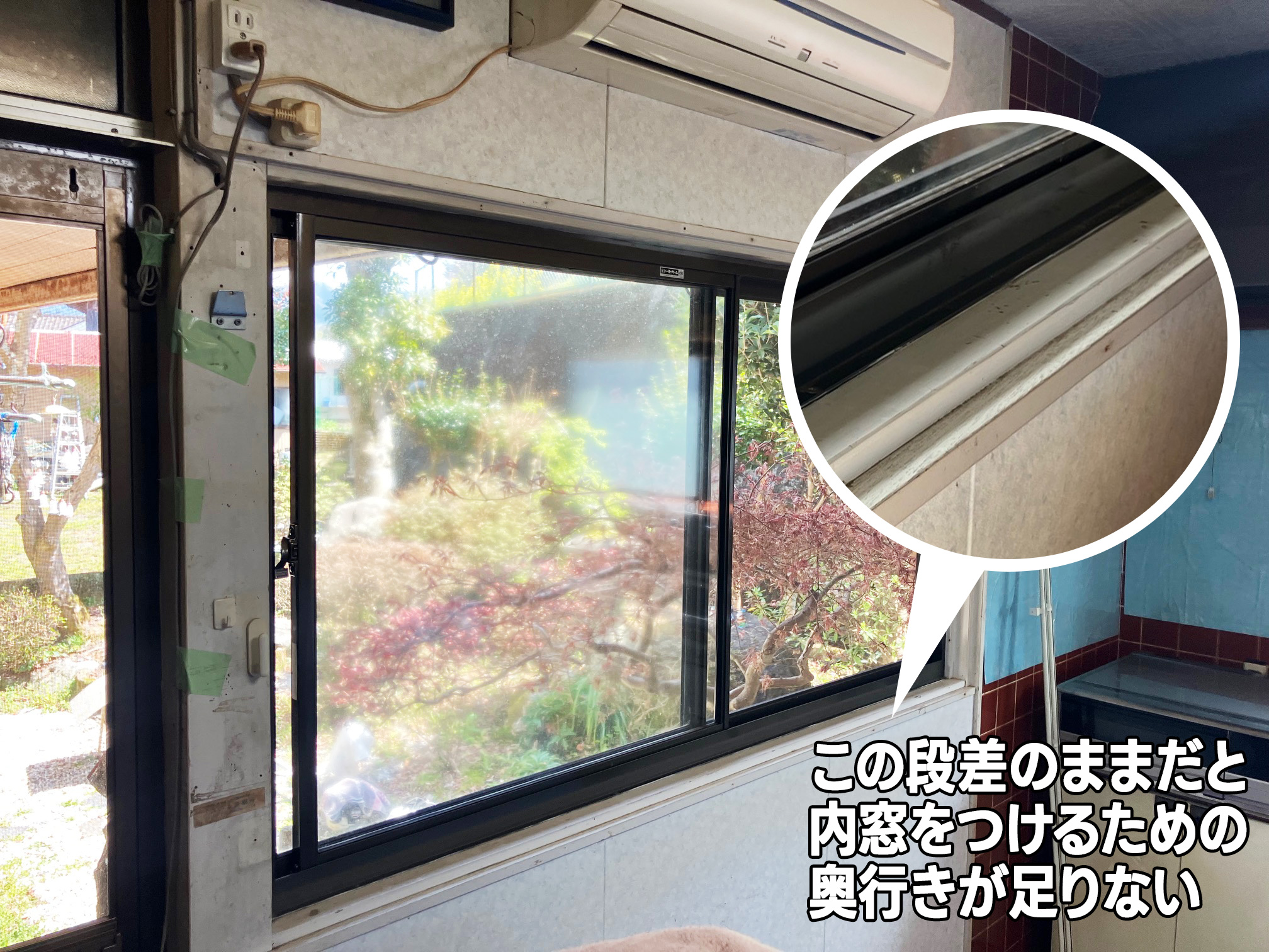 この段差のままだと、内窓をつけるための奥行きが足りない…。