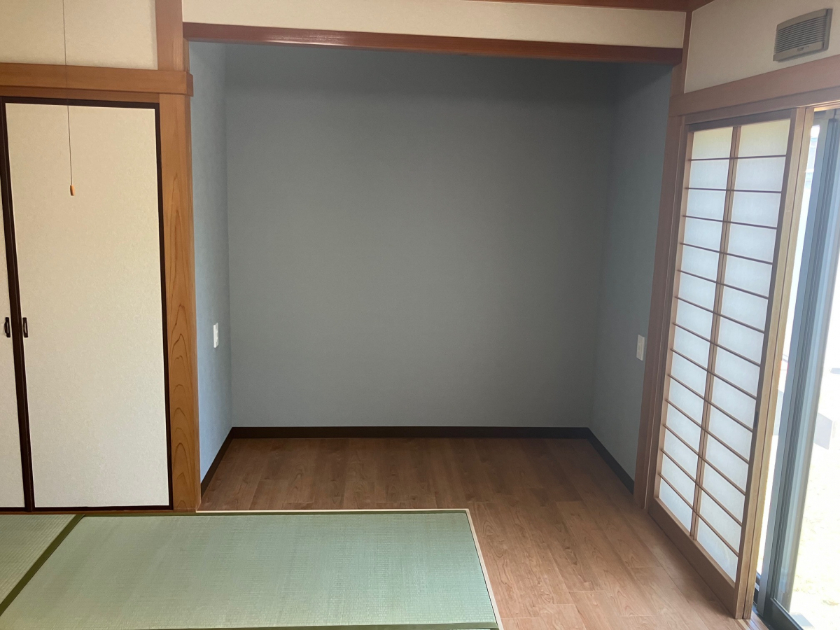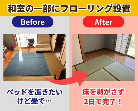 そんなお施主様のお悩みを解決すべく、畳6帖の1階和室を一部フローリング材に変える床リフォームを行い、その場所にベッドを置くこととなりました。