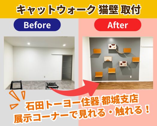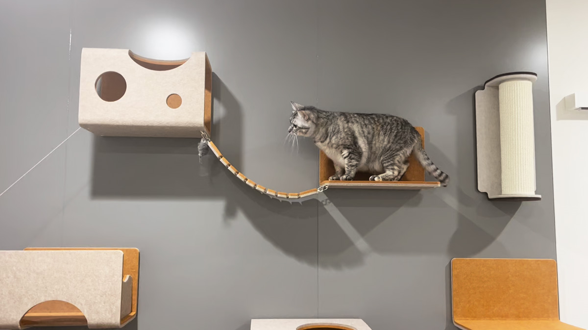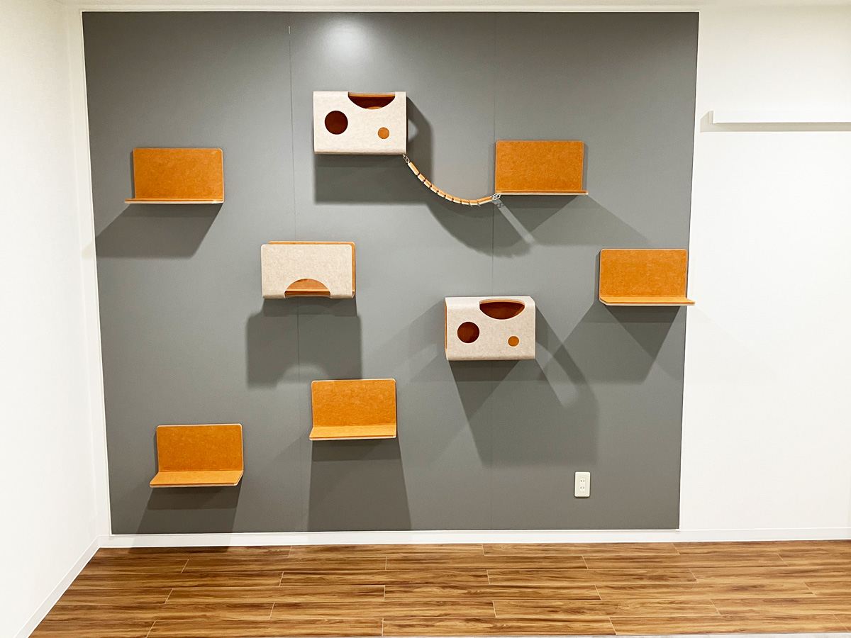 石田トーヨー住器 都城支店に設置された猫壁(にゃんぺき)は、実際に猫ちゃんに体験してもらうことができます!